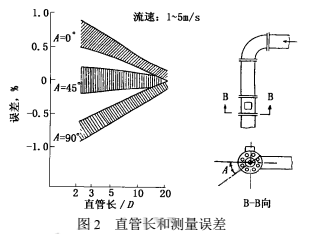 2000年上海原水公司擬在已建成的某泵站加裝DN2200智能硫酸流量計,但彎管下游安裝位置的前直管長度明顯不符合規(guī)定中5D~10D(D為管徑,下同)的要求,此時,影響測量誤差有多大呢?