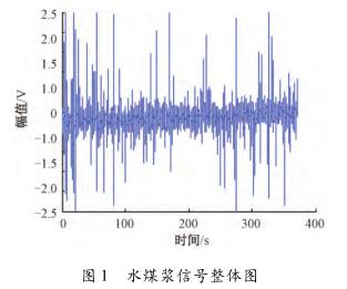 針對水泥泥漿流量計測量水煤漿時出現較大波動,甚至回零這一問題,特去某煤化工企業甲醇分公司進行現場數據采集。該公司所使用的對置式四噴嘴氣化有4個噴嘴,噴嘴管道口徑為125mm,管中水煤漿流量基本穩定在19m³/h(流速約為0.48m/s)。每條噴嘴煤漿線上安裝了3臺水泥泥漿流量計,每臺水泥泥漿流量計由傳感器和變送器兩部分組成。選擇其中1條水煤漿管線上的1臺水泥泥漿流量計進行數據采集,因為該臺水泥泥漿流量計測量結果波動大,甚至出現回零的現象。將課題組研制的基于DSP的電磁流量變送器的信號線和勵磁線接到該電磁流量傳感器的電極和勵磁線圈上,組合成完整的水泥泥漿流量計,進行水煤漿數據采集。使用的電磁流量變送器是以TI公司DSP芯片TMS320F28335為核心,采用高頻勵磁方案,其硬件主要包括勵磁控制系統和信號采集處理系統,具體的模塊有勵磁驅動模塊、信號調理采集模塊、信號處理控制模塊、人機接口模塊、通信模塊及電源管理模塊。信號調理采集模塊中的調理電路對一次儀表輸出的信號進行放大和濾波,截止頻率是2kHz,放大倍數約為230倍。通過NI公司USB-6216型號的數據采集卡進行數據采集,把調理電路的輸出端連接到數據采集卡的一個差分輸入端,并設置數據采集卡工作在差分的測量模式,設置采集卡的采樣頻率為10kHz。采集多組水煤漿信號數據,每組數據的時間長度為5min。