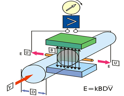 當導電液體沿測量管在交變磁場與磁力線成垂直方向運動時,導電液體切割磁力線產(chǎn)生感應電勢。在與測量管軸線和磁力線相互垂直的管壁上安裝了一對檢測電極,將這個感應電勢檢出。