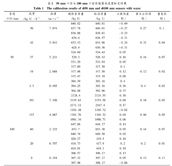 由標(biāo)定結(jié)果可知,所研制的耐酸堿管道流量計(jì)系統(tǒng)針對50mm口徑的水流量標(biāo)定示值誤差小于0.41%,重復(fù)性誤差小于0.11%。針對100mm口徑的水流量標(biāo)定示值誤差小于0.21%,重復(fù)性誤差小于0.12%。據(jù)此可知,所研制的耐酸堿管道流量計(jì)系統(tǒng)針對50mm與100mm口徑的水流量標(biāo)定精度均優(yōu)于0.5級。