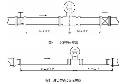 硝酸管道流量計的安裝質(zhì)量對其測量結(jié)果的影響較大,因此在安裝時需要注意幾個問題。*先,硝酸管道流量計直管段的選擇在配管時一定要按照要求進行選擇,一般選擇流量計通徑與工藝管道通徑相同,即可滿足工程需要,而且安裝方便、壓力損失小,流量計直管段上游側(cè)的長度不少于5倍工藝管道直徑,下游側(cè)的長度不少于3倍工藝管道直徑(圖2)。但在流速太慢而又要求精度較高或需要變徑的應用場合,可選擇通徑小于工藝管道通徑的流量計,以提高測量精度,此時流量計上、下游必須加裝異徑管,且進口異徑管上游側(cè)應有長于10倍工藝管道直徑的直管段,下游側(cè)應有長于5倍工藝管道直徑的直管段(圖3)。