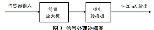 信號處理器對渦街流量傳感器產(chǎn)生的頻率信號經(jīng)過濾波、放大、頻電轉換等幾個環(huán)節(jié)處理,*終將頻率信號轉換為標準4~20mA信號輸出。信號處理器框圖如圖3所示。