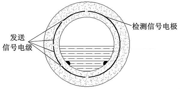 ①多電極式非滿管工業污水流量計。其底部是一對信號注人電極,中間有多對測量電極,頂端有一個滿管電極。在滿管情況下,該流量計與普通的工業污水流量計的功能相同,滿管情況下流體的橫截面積是固定的,此時計算流量值只需要測量流體的流速即可。當流體非滿管時,滿管電極檢測到管道非滿狀態,利用算法修正測量值,此時流量計的測量方式改成測量流體流速和液面高度。信號注人電極與在不同位置的三對測量電極共同工作,用于測量液位面的高度和流體的速度。多電極式非滿管工業污水流量計結構簡圖如圖3所示。
