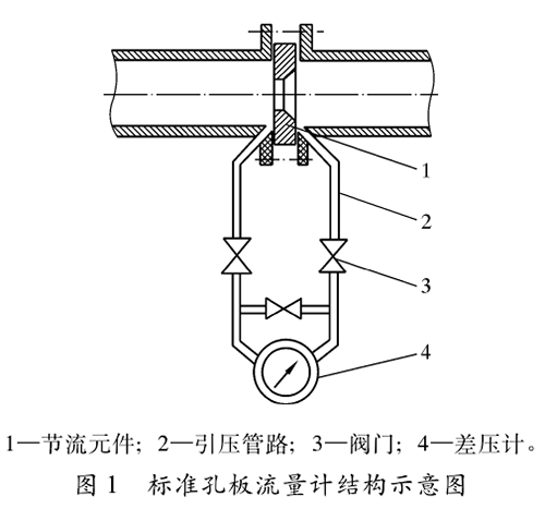 標(biāo)準(zhǔn)二氧化碳流量計(jì)結(jié)構(gòu)如圖1所示,包括節(jié)流元件(標(biāo)準(zhǔn)孔板及其取壓裝置)、傳輸壓差信號(hào)的引壓管路、閥門以及差壓計(jì)等部分。標(biāo)準(zhǔn)孔板是壓差測(cè)量時(shí)的一次元件,人們利用它在管道內(nèi)使流體產(chǎn)生壓差,再通過(guò)引壓管路把孔板前、后產(chǎn)生的壓差傳送給差壓變送器,再輸人到二次儀表,從而顯示出管道內(nèi)流體的靜壓、壓差、瞬時(shí)流量和累計(jì)流量等計(jì)量參數(shù)。