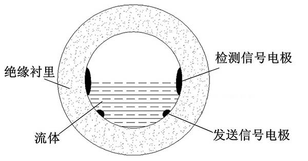 ①多電極式非滿管管道式電磁流量計。其底部是一對信號注人電極,中間有多對測量電極,頂端有一個滿管電極。在滿管情況下,該流量計與普通的管道式電磁流量計的功能相同,滿管情況下流體的橫截面積是固定的,此時計算流量值只需要測量流體的流速即可。當流體非滿管時,滿管電極檢測到管道非滿狀態,利用算法修正測量值,此時流量計的測量方式改成測量流體流速和液面高度。信號注人電極與在不同位置的三對測量電極共同工作,用于測量液位面的高度和流體的速度。多電極式非滿管管道式電磁流量計結構簡圖如圖3所示。