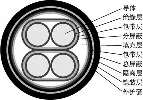 該新型電纜的結(jié)構(gòu)如圖1所示。導(dǎo)體為單股退火鍍錫軟銅線,以提高導(dǎo)體的導(dǎo)電性和防腐蝕性。在導(dǎo)體外繞包一層薄F4(聚四氟乙烯)半導(dǎo)電帶,有利于降低導(dǎo)體和絕緣之間的摩擦起電噪音。絕緣采用材料較為純凈、介電常數(shù)較小、具有一定彈性的聚丙烯絕緣級材料,并采用擠壓式擠出,減小絕緣層與導(dǎo)體的間隙。采用對絞組作為信號傳輸線,由于在兩根傳輸線上感應(yīng)的電壓接近相等,減小了電壓差值,提高了信號傳輸穩(wěn)定性;對絞組由兩種不同顏色絕緣線芯組成,相鄰線對對絞節(jié)距應(yīng)不大于100mm。對絞分屏蔽組(即對對絞組進(jìn)行分屏蔽,每對對絞組外繞包兩層聚酯帶和一層厚0.04mm鋁塑復(fù)合帶繞包,內(nèi)置一根7×0.26mm鍍錫銅絞線作引流線)有利于對不同對絞組之間信號串音的抑制和隔離。對絞分屏蔽組同心式絞合成纜,在對絞分屏蔽組間填充非吸濕性材料,以保證纜芯圓整。在成纜纜芯外繞包兩層聚酯帶,再采用鋁塑復(fù)合帶繞包,內(nèi)置鍍錫銅線作引流線,以提高電纜電磁屏蔽能力。總屏蔽層外擠包隔離層(隔離護(hù)套),隔離層采用絕緣級低密度聚乙烯材料。隔離層外采用鎧裝層,鎧裝材料為高導(dǎo)磁合金鋼帶,其為強(qiáng)磁材料,可將外來的磁通大部分限制在鎧裝層的外表面上(僅有少部分能進(jìn)入被屏蔽的空間);鎧裝時(shí)對高導(dǎo)磁合金鋼帶采用縱包焊接,確保其形成一連續(xù)圓柱管;鎧裝層可提高電纜抗電磁干擾水平以及對電纜進(jìn)行加強(qiáng),減少電纜振動(dòng)引起的電動(dòng)勢。外護(hù)套采用藍(lán)色軟PVC(聚氯乙烯)護(hù)層級電纜材料擠包,實(shí)現(xiàn)電纜防護(hù)。