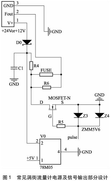 從圖1 中可以看到,供電電源 +24 V, +12 V均可,直流電源通過(guò)瓷片電容 C1 濾掉部分紋波,然后通過(guò)線性穩(wěn)壓芯片 78M05,得到 + 5 V 電壓,為后面的氮?dú)饬髁坑?jì)信號(hào)處理電路供電,若要再得到 3. 3 V 電壓,通常會(huì)在 78M05 后再加一片線性穩(wěn)壓芯片 LM1117-3. 3,為了節(jié)約成本,供電電路沒(méi)有做 EMS 設(shè)計(jì)。同時(shí),脈沖輸出部分,僅通過(guò)一個(gè) MOS 管和兩個(gè)穩(wěn)壓管,也沒(méi)有 EMS 方面的設(shè)計(jì)考慮。