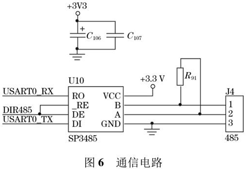 管道流量計輸出的流量值可以通過外接的 TFTLCD 屏直接顯示,還可以通過預留的 RS485 通信接口將數據發送到上位機中。RS485 電路*大的優點是 485 電平與 TTL 電平兼容,方便與 TTL 電路相連;抗共模干擾能力強;數據傳輸速度快,高達 10 Mbps;通信距離遠,*大為 1.2 km。系統采用 SP3485 芯片進行數據通信,SP3485 是一款低功耗芯片且符合RS485 協議的收發器,電路圖如圖 6 所示。