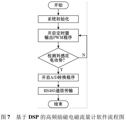 軟件流程圖如圖7 所示。軟件采用模塊化的設計方法,主要設計了勵磁控制切換程序、PWM 波產生程序、A/D 轉換程序以及 RS485 通信程序等。系統上電后*先執行復位操作,利用 DSP 內部的定時器產生PWM 波控制 H 橋電路中的勵磁方式,當系統檢測到傳感器線圈輸出的感應電動勢后,利用 DSP 內部的 12位 A/D 轉換器對此信號進行模數轉換,*后根據相應算法計算出管道中被測液體的流量。