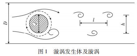 氫氣流量計是由漩渦發(fā)生體、頻率檢測器和信號轉(zhuǎn)換器等環(huán)節(jié)組成,輸出 4 ~ 20 mADC 信號或脈沖電壓信號。其測量原理是在流動的流體中的垂直流動方向安放 1 根或多根非流體型阻流體,在一定的流量范圍內(nèi),流體在阻流體兩側(cè)交替地分離、釋放出 2 串頻率正比于管道內(nèi)的平均流速、規(guī)則的、不對稱有規(guī)律的交替漩渦列,如圖 1 所示,且兩側(cè)漩渦旋轉(zhuǎn)方向相反。采用檢測元件測出漩渦頻率就可以推算出流體的流量。