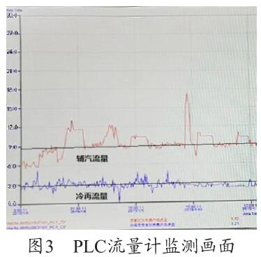 通過圖3 PLC 流量計監測畫面可以看出,PLC 上輔汽測量用的沼氣流量計的量程設置為30t/h,現場設備量程實際為6t/h,兩者嚴重不符,因此測量值4t/h 為錯誤值(單臺機組運行),需要對程序進行修改。