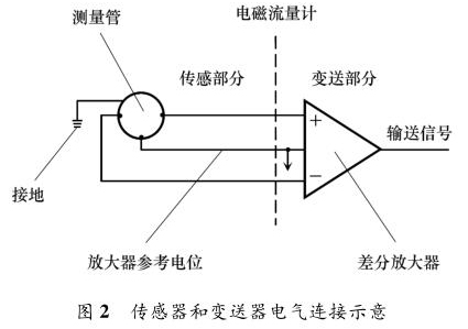 防腐型電磁流量計主要由兩部分組成:流量傳感器和信號變送器,如圖 2 所示。傳感器上的勵磁線圈接受變送器傳輸來的勵磁電流產生磁場,輸出感應電動勢信號;信號變送器則將感應電動勢信號轉換為流量信號或模擬量信號送至控制系統。防腐型電磁流量計按組成方式分為一體式和分體式。防腐型電磁流量計穩定工作另外一個重要條件是接地。當流體流動穿過磁場時,以導電流體本身作為參考電位,在測量管一側電極產生正電勢,另一側產生負電勢,形成電勢差。但此電動勢信號一般只有幾毫伏,易受外界干擾。為防止干擾,將參考電位接入大地作為零電位,保證傳感器輸出精確穩定的信號。傳感器和轉換器的接地端必須與被測介質同電位,才能構成對稱的輸入輸出回路。