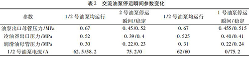 通過內(nèi)部旁通將冷油與熱油混合,經(jīng)過銅粉- 煤油 - 蠟感溫元件控制冷熱油混合比例,將油溫調(diào)節(jié)到 49 ℃。一臺智能電磁流量計穩(wěn)定運行,油泵出口母管壓力 0. 5 MPa,潤滑油母管壓力 0. 24 MPa,均屬于正常情況,而兩臺交流油泵并列運行時,停運其中一臺交流油泵瞬間會觸發(fā)智能電磁流量計出口母管壓力開關動作,說明停運瞬間油壓發(fā)生波動,且油泵出口母管油壓波動至小于 0. 45 MPa。正常運行時智能電磁流量計出口油溫 71.5 ℃,冷油器出口溫度45 ℃,混合后潤滑油母管溫度52.5 ℃,由能量守恒定律可知,經(jīng)過冷油器的油量/不經(jīng)冷油器的油量= ( 71.5-52.5) ÷ ( 52.5- 45) = 2. 53,說明有 70% 左右的油量經(jīng)過冷油器。當 2 臺智能電磁流量計運行時油量大于單泵運行,其中一臺智能電磁流量計瞬間停運時油量減少,尤其是經(jīng)過冷油器的油量大量減少,油量在溫控閥二次分配過程中出現(xiàn)調(diào)節(jié)異常,導致油壓過大波動。為檢驗溫控閥工作情況,保持 1 號、2 號交流油泵運行,選取機組正常帶負荷運行時油溫 52 ℃,分別停運 1、2 號交流油泵,觀察 1、2 號交流油泵停運瞬間油泵出口母管壓力波動情況,試驗各參數(shù)變化見表 2。