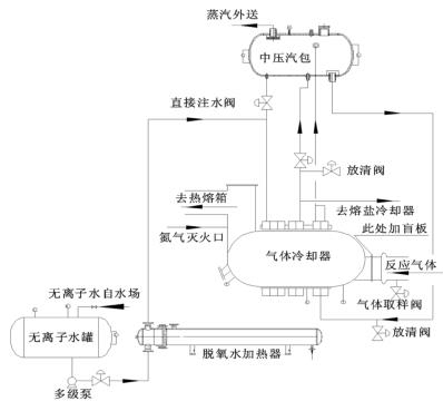 來(lái)自無(wú)離子水罐的脫氧水經(jīng)多經(jīng)泵加壓、經(jīng)脫氧水加熱器加熱后進(jìn)入到智能型渦街流量計(jì)的水段,脫氧水與反應(yīng)氣體換熱后分兩路:一路進(jìn)入中壓汽包,保證汽包有穩(wěn)定的液位;一路進(jìn)入熔鹽冷卻器帶出熔鹽攜帶的反應(yīng)熱。來(lái)自中壓汽包的高溫水經(jīng)管路接至智能型渦街流量計(jì)汽段底部,高溫水與反應(yīng)氣體換熱后產(chǎn)生高壓蒸汽,高壓蒸汽又返回中壓汽包。汽包還有一路直接注水管路,此路水不經(jīng)過(guò)智能型渦街流量計(jì)水段,而是直接進(jìn)入汽包。在智能型渦街流量計(jì)出口溫度偏低而汽包液位也比較低時(shí),可開此直接注水管路來(lái)穩(wěn)定汽包液位。其詳細(xì)流程圖如圖 2。