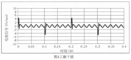 工頻干擾是高壓渦輪流量計常見的干擾源。當流量計處于電源形成電磁場中時,由于分布電容的存在,以電磁波的輻射形式干擾電極信號,或者是由供電電源引入的工頻串擾,工作現場的工頻共模干擾,其產生的物理機理均是電磁感應原理。幅度與流量信號相比,往往要大幾個數量級,頻率與供電電源頻率相同。如圖4所示,線圈驅動頻率為5Hz的電極信號,被耦合了50Hz的工頻干擾,幅度大概相當于1feet/s。