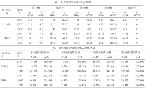 為了深入研究溫度及流量突變對衛生級電磁流量計響應速度的影響趨勢,把每個流量突變點前后的出口壓力p2,流量q列表如表1所示。