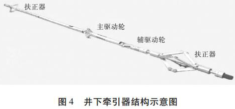牽引器采用的是 Sondex 公司的牽引器,如圖 4所示。儀器外徑 54 mm,長度 7.4 m,牽引力 273 kg,耐壓103 MPa,耐溫 150 ℃,牽引速度 540 m/h。牽引器連接于電纜頭和測井儀器之間。在水平段和造斜段儀器不能靠自重下放,利用牽引器可以將儀器推送到測井目的層段。井下牽引器由兩組呈 90°交叉分布的驅(qū)動臂和扶正器組成。在進行井下儀器牽引時,*先打開牽引器驅(qū)動臂,使驅(qū)動臂端部的驅(qū)動輪支撐到套管壁并保持足夠的正壓力,然后驅(qū)動輪旋轉(zhuǎn)實現(xiàn)對儀器的推送。井下儀器牽引過程可在地面進行人工控制,通過控制命令和調(diào)整供電電壓可控制井下牽引速度和方向。該牽引器提供了多種井下測量參數(shù),包括電纜頭電壓和張力、牽引速度、接箍深度等數(shù)據(jù),所有這些沿井身測量到的參數(shù)均可在地面顯示出來,使施工具有安全性和可操作性。當(dāng)斷開電源時,驅(qū)動臂在外力作用下可收回,保證儀器安全取出。