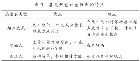 目前供熱行業內使用的熱量計量儀表按工作原理主要分為超聲波式、 電磁式、 差壓式, 其特點見表 1 。 熱量計量儀表按結構可分為一體式和分體式, 一體式熱量表將一支入口或出口溫度傳感器嵌入到流量傳感器管道中, 并配有專門的計算器進行熱量計算; 分體式熱量表采用單獨的流量傳感器, 包括超聲波流量計、 電磁流量計、 差壓流量計、流量計等, 溫度測量采用單獨的鉑電阻溫度計或溫度變送器測量供回水管道溫度, 再配備熱量積算儀進行溫度和流量信號采集得到熱量值。