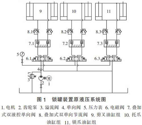 防爆型渦街流量計原液壓系統圖如圖 1 所示。 通過分析圖 1 發現,原液壓系統中剪叉油缸組、托爪油缸組及鎖爪油缸組并聯安裝,并均由齒輪泵供油,該系統設計簡單,液壓元件選擇不夠合理,工作效率低,電機發熱大,主要存在的問題: