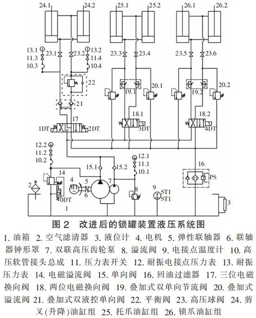 (2)由于升降油缸和托、鎖爪油缸的工況不同,所需油壓也不同,原液壓系統中齒輪泵統一供油,整個工作過程中系統功率消耗大,不夠節能,工作電機始終帶載運行,不僅功率損耗大,而且易引起油溫急劇增加,對整個提升系統及液壓系統的性能和壽命造成惡劣影響;
