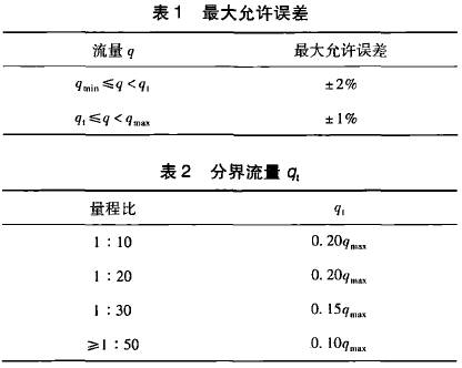 在GB21391--2008《用天然氣渦輪流量計測量天然氣流量》對分界流量q,有明確的定義,即低于該流量要采用擴展誤差限的流量值。標準*5.2條從*大允許誤差和量程比兩方面對分界流量做出了規定,且明確了量程比是在*大允許誤差范圍內流量計的*小流量和*大流量之比。該標準中對渦輪流量計要求的*大允許誤差如表1所示,量程比與分界流量q,的關系如表2所示。