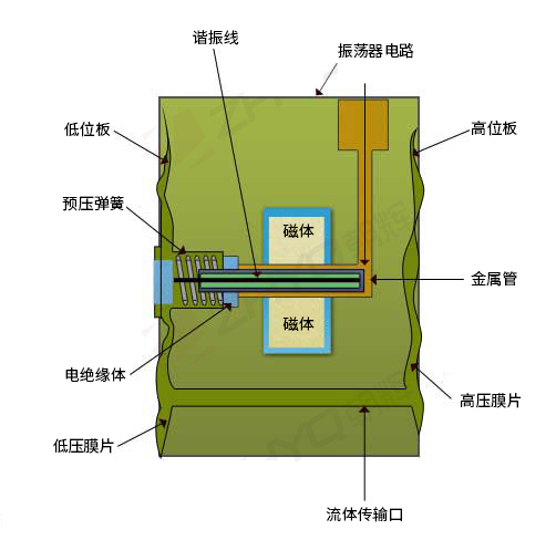 由磁場驅(qū)動的振蕩器電路會導(dǎo)致導(dǎo)線以其共振頻率振蕩。導(dǎo)線的一側(cè)牢固地固定到靜態(tài)部件,而另一側(cè)則連接到膜片。彈簧使電線預(yù)緊。由于過程壓力對隔膜的影響,金屬絲將在壓力升高時拉伸,而在壓力降低時收縮。共振頻率將相應(yīng)地增加或減少。數(shù)字計數(shù)器測量諧振頻率的變化,并將其信號傳遞給微芯片,該微芯片還處理線性化補(bǔ)償和溫度補(bǔ)償。