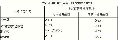 2) 浸入式 帶測量管的浸入式流量傳感器和插入式儀表需要一定長度前置直管段,iso/dis 14511對此未作具體規定,而按制造廠建議的值。bs 7405建議對于在管道中用插入熱絲流速計時,需要(8~10)d的上游直管段和(3~5)d的下游直管段。表4列舉sierra公司對帶測量管浸入式tmf所規定的上直管段長度;若在其進口端裝一塊或二快多孔板式流動調整器(整流器)后,則其長度可大為縮短,如表*右列所示。