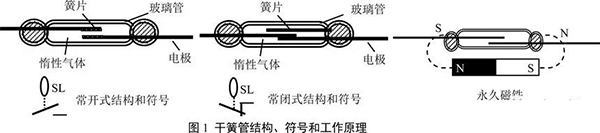 干簧管開關(guān):由一組或幾組導(dǎo)磁金屬簧片封裝在充有惰性氣體的玻璃管中組成的元件,每組簧片既能導(dǎo)磁又能導(dǎo)電,起開關(guān)電路和磁路的雙重作用,如圖1。對于常開型:當(dāng)干簧管在外加永久磁場或電磁場的作用時,干簧管中的兩根簧片分別被磁化,在兩根簧片接近的地方產(chǎn)生異性磁極而吸引,兩根簧片相接觸使電路導(dǎo)通。反過來,當(dāng)磁場取消時,簧片依靠本身的彈性力恢復(fù)原狀,兩簧片分離,電路斷開,這樣便完成了一個開關(guān)的作用。常閉型干簧管原理可自行分析。干簧開關(guān)有許多優(yōu)點:由于接點密閉在充滿惰性氣體的玻璃管中,不易腐蝕、氧化和污染,接點免于維護(hù);接通或釋放的時間只有1~3毫秒,僅為電磁繼電器的1/5~1/10,可以作為速動開關(guān)使用;由于接點部分使用了金、鐒、鈀合金鍍層,壽命長,開關(guān)約為106~107次。