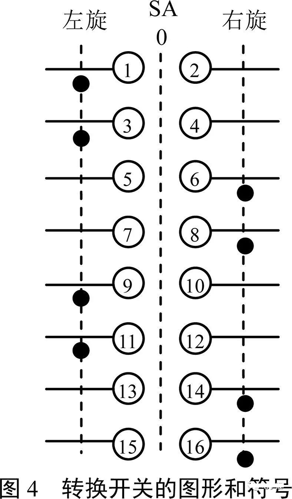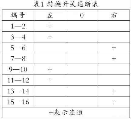 圖4是一款轉(zhuǎn)換開關(guān)的圖形和符號,表1是它在左旋和右旋兩個部位時8個開關(guān)對應(yīng)的通斷情況。
