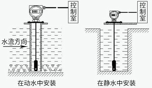 纜式靜壓液位計(靜壓式水位計)通常投入直徑大于水位計直徑的的PVC管、鋼管,管道固定在水中,不同高度打若干小孔,以便水通暢進入管內?;蛘咴诘撞考友b阻尼裝置,以過濾泥沙和消除動態壓力和波浪對測量的影響。