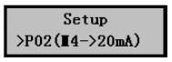 1)在儀表正常工作時按擊Mode鍵進入?yún)?shù)設置菜單后按擊▼鍵選擇P02(4~20mA)設置菜單,如右圖。