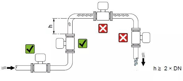 管路必須完全充滿液體。保證管路始終充滿液體至關(guān)重要,否則流量顯示會受到影響,而且還會出現(xiàn)測量錯(cuò)誤。管路結(jié)構(gòu)的設(shè)計(jì)必須要保證測流管始終充滿流體。當(dāng)流體有分流或含有固體顆粒沉淀物時(shí),建議使用垂直安裝。但采用垂直安裝時(shí),要遵循流體從下到上的走向,以保證管路充滿流體。