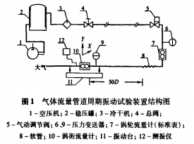 氣體流量管道周期振動試驗裝置結(jié)構(gòu)如圖1。為避免氣體壓力波動,圖中設(shè)備1先將空氣壓縮打人2中,經(jīng)3冷卻除濕后,得到的純凈氣體先后流經(jīng)4、5、7、10后,通向大氣。流量校準采用渦輪標準表法,渦輪流量計內(nèi)徑50mm,流量范圍5~100m3/h,精度為1%。兩臺壓力變送器的精度均為2‰。