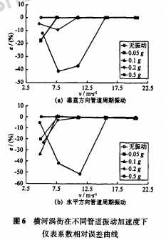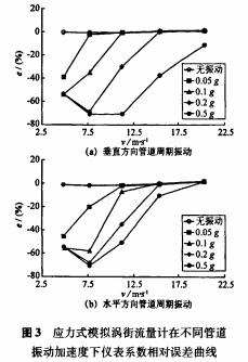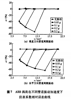 (1)管道振動加速度為0.05g、0.1g時,儀表系數(shù)相對誤差隨流速的升高而減小,*終減小至零;