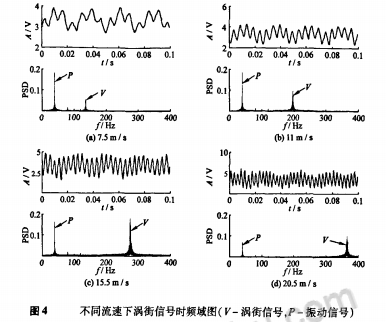 為了觀測管道周期振動下渦街流量信號的特征,利用NI USB-6009數(shù)據(jù)采集卡對渦街正弦信號進行采樣。以垂直方向管道振動加速度為0.1g為例,給出了不同流速下渦街信號的時頻域圖,如圖4所示。由時域部分可知,管道振動下渦街流量傳感器輸出的信號為真實旋渦脫落信號和管道振動信號的合成信號。低流速(≤1lm/s)時,管道振動信號強、占主要成分,渦街信號疊加在其上;隨著流速變大(11~20.5m/s),渦街信號逐漸顯露出來成為主要成分、淹沒振動信號。由頻域可知,振動信號成分較單一,呈尖峰狀,幅值為定值,不隨流速變化而變,除40Hz基頻外還有2、3倍頻出現(xiàn);而渦街信號成分稍復(fù)雜,呈塔峰狀,幅值隨流速變大而迅速增強,頻譜能量占總能量比重也隨流速增加而變大。