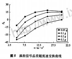 圖5給出了不同管道振動加速度下渦街信號品質(zhì)隨流速變化的情況。不論振動加速度如何變換,Sq的變化趨勢都是隨著流速的增加而變大,但Sq何時由負變正,則與振動加速度密切相關(guān)。相同流速下,管道振動加速度越大,Sq值越小,渦街信號品質(zhì)越差。Sq小于零時,表明由振動引起的其他頻帶能量大于渦街頻帶能量,且Sq絕對值越大,渦街信號品質(zhì)越差,渦街流量計的測量誤差越大;Sq大于零時,表明渦街頻率帶的能量大于其它頻帶的能量,管道振動對渦街信號影響較小,且Sq值越大,渦街信號品質(zhì)越好,渦街流量計的測量誤差越小。這也與圖3(a)得到的試驗結(jié)果完全吻合。