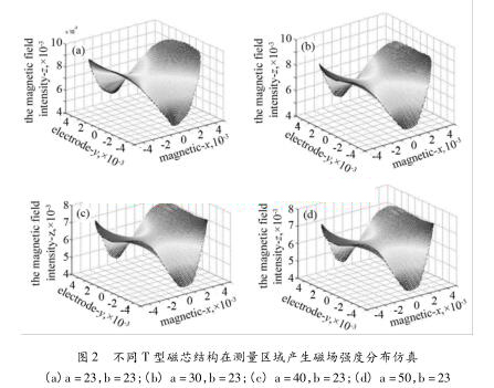 從仿真結果可以看出:T型磁芯的較長端的角度a越小,流量計電極兩端獲得的感應信號越大;在T型磁芯的較長端的角度a一定時,T型磁芯的較短端的角度b越小,流量計電極兩端獲得的感應信號越大。這主要是因為井水流量計勵磁線圈的增加,使得流量計測量區域的磁場強度增加,同樣分布的流速下使得流量計電極兩端的感應信號增加。