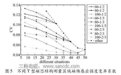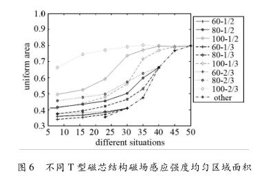 如圖3所示為不同T型磁芯結構下測量區域產生磁場感應強度平均值,圖中橫坐標為T型磁芯b的角度,縱坐標為測量區域的平均磁場強度,圖標表示的是T型磁芯的不同a的角度以及磁芯長端寬度所占的比例。其中以“角度-比例”表示,例如30-1/2表示T型磁芯的較長端角度a為30°,k1/(k1+k2)為1/2時的測量區域中平均磁場強度測量結果。圖標Other為T型磁芯較長端的角度a與較短端的角度b相等(即為23,30,35,40,45,50)時的流量計測量區域中的平均磁場強度。從仿真結果可以看出:T型磁芯的較長端的角度a越小,流量計測量區域中平均磁場強度越大;在T型磁芯的較長端的角度a一定時,T型磁芯的較短端的角度b越小,流量計測量區域中平均磁場強度越大;在T型磁芯的較長端的角度a與較短端的角度b一定時,T型磁芯的k1/(k1 + k2)越小,在流量計測量區域中平均磁場強度越大。